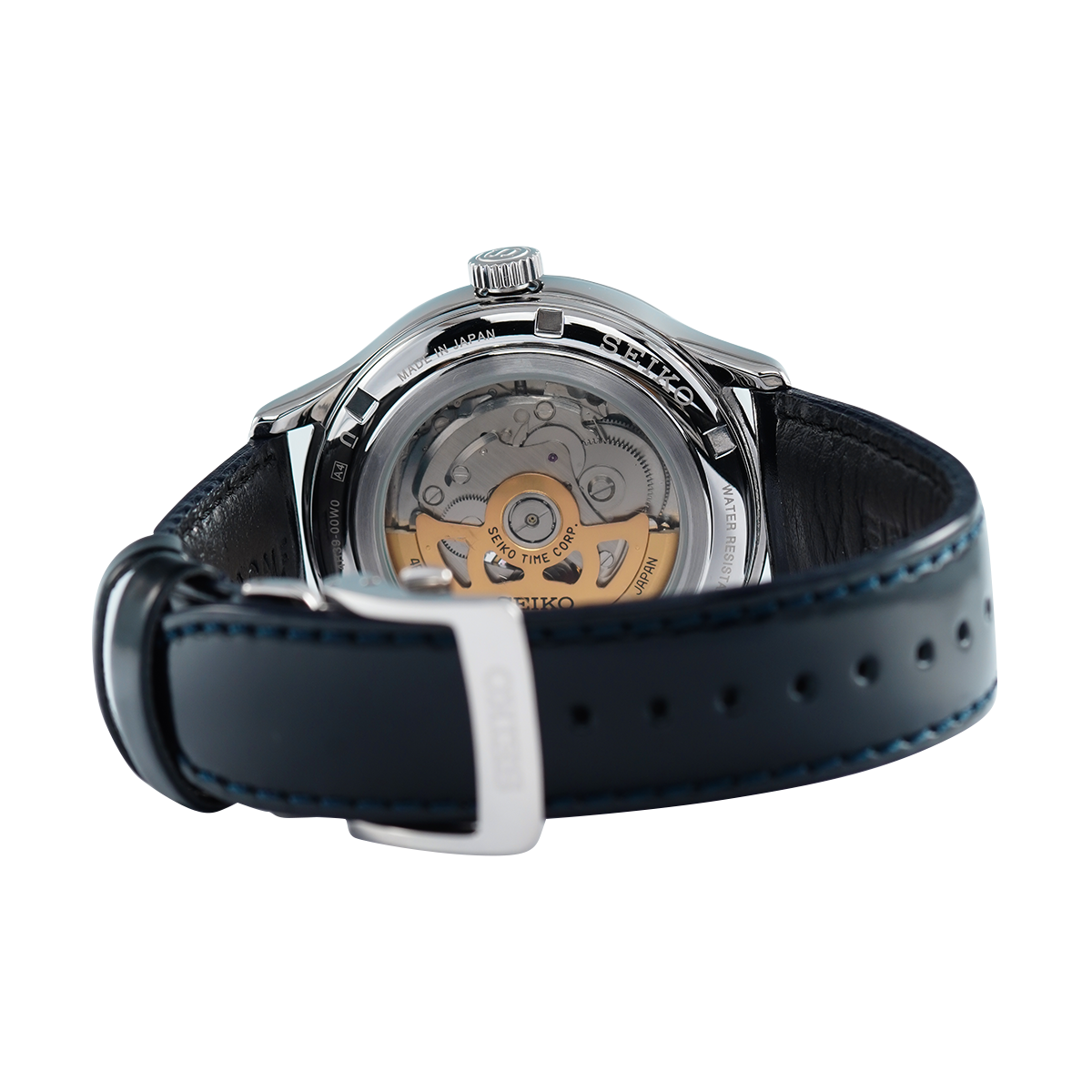 ( Tampak Belakang Jam Tangan Seiko Presage SSA421J1 Zen Garden Sakura Automatic Open Heart Blue Dial Black Leather Strap. Sumber: carolinawatch.id )