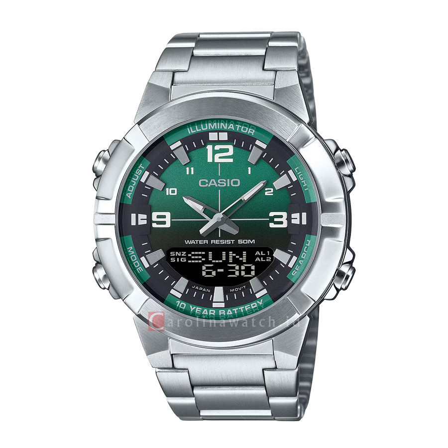 Jam Tangan Casio Analog-Digital Combination AMW-870DA-3A Men Green Dial Stainless Steel Band