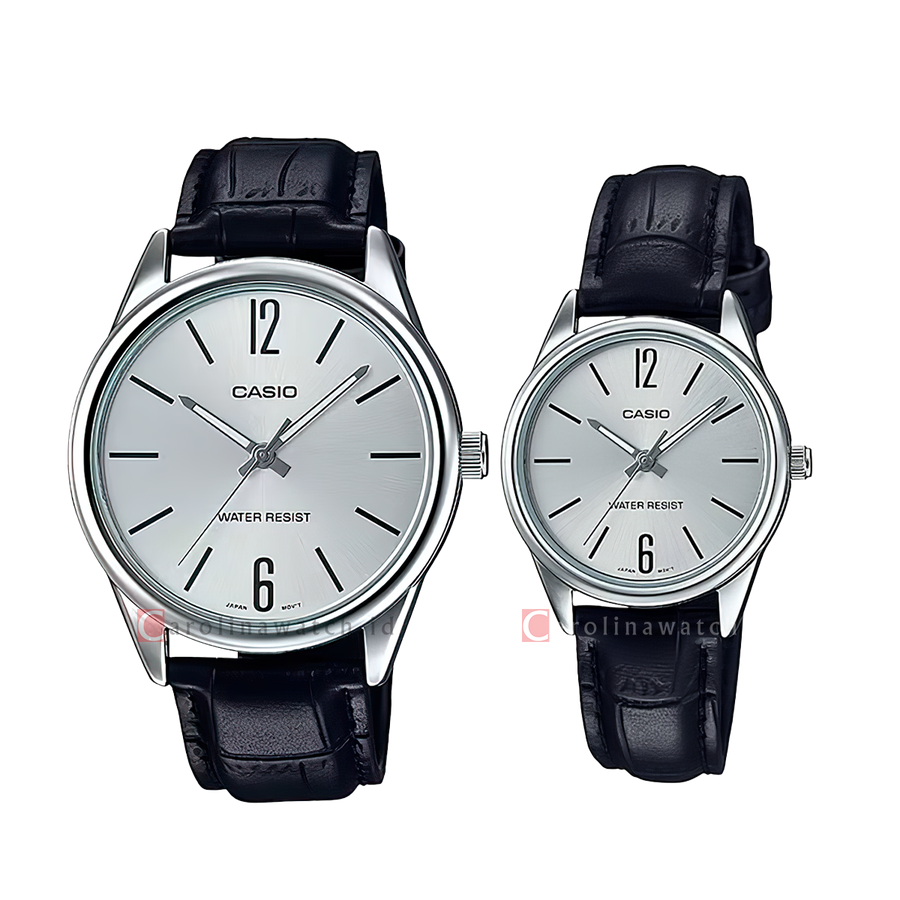 Jam Tangan Couple Casio M/LTP-V005L-7B Silver Dial Black Leather Strap