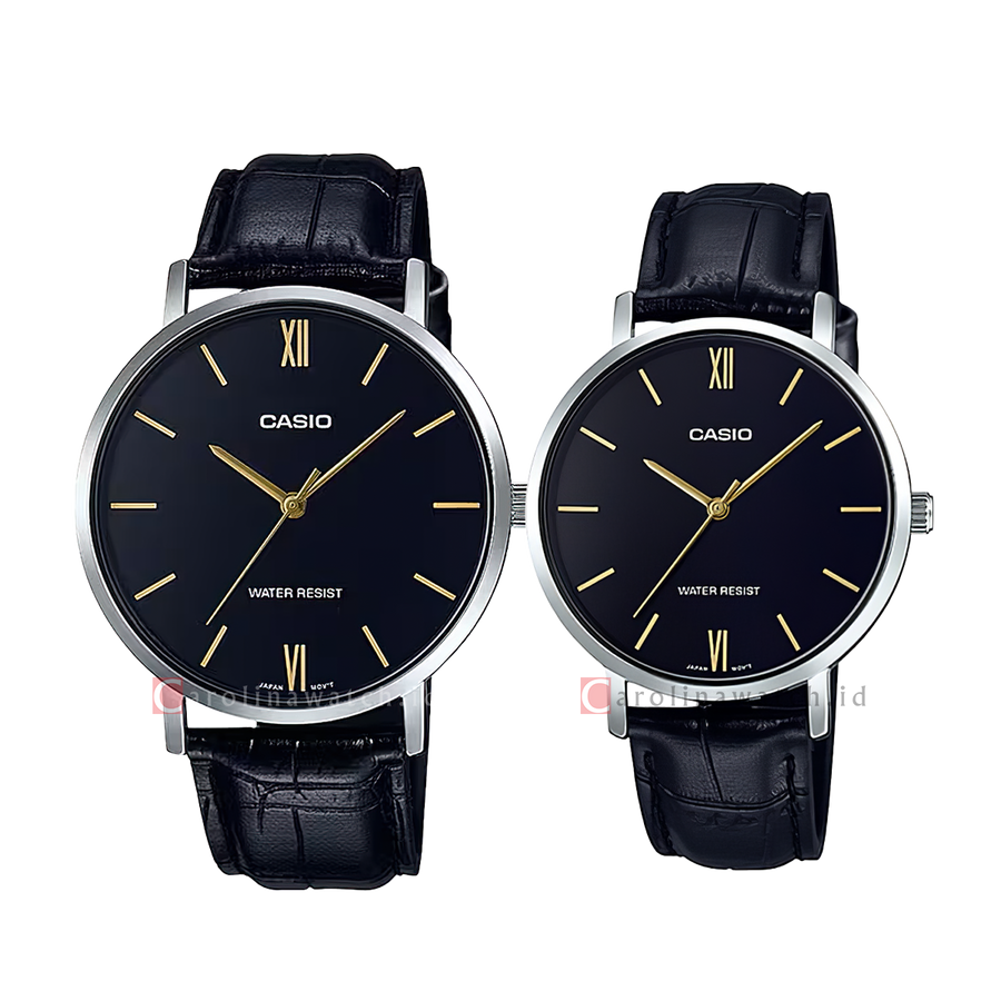 Jam Tangan Couple Casio M/LTP-VT01L-1B Black Dial Black Leather Band
